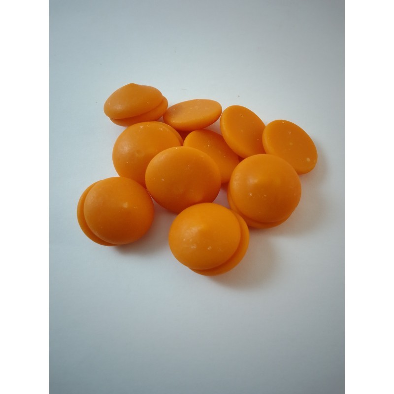 INGREDIENTES: azúcar, manteca de cacao 29%, leche entera en polvo, emulgente: lecitina de soja, aroma natural de naranja, colorante: E160e, aroma natural de vainilla. ALÉRGENOS: Presente en el producto suministrado según su receta/composición: Soja y productos a base de soja; Leche y sus derivados (incluida la lactosa). Posiblemente presente en el producto acabado sin intención (Trazas): Cereales que contengan gluten (trigo, centeno, cebada, avena, espelta, kamut o sus variedades híbridas) y productos derivados.