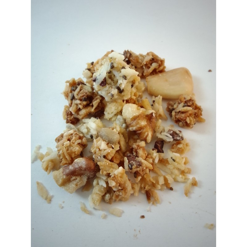 INGREDIENTES: Coco rallado (41.60%), fibra soluble de Tapioca (15.84%), almendras (8.35%), eritritol (6.69%), aceite de coco (6.28%), nueces, pipas de girasol, semillas de chía, semillas de sésamo, nibs de cacao, proteína de cáñamo y sal rosa del Himalaya*. * Producción no ecológica. ALÉRGENOS: Contiene frutos de cáscara (almendras y nueces) y sésamo. Puede contener trazas de otros frutos de cáscara, cacahuete, soja, sulfitos, lácteos y sus derivados