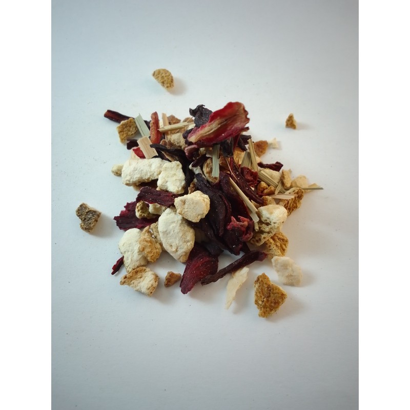 Flor de hibisco, cáscara de limón, cáscara de naranja, lemongras, triángulos de naranja y aroma