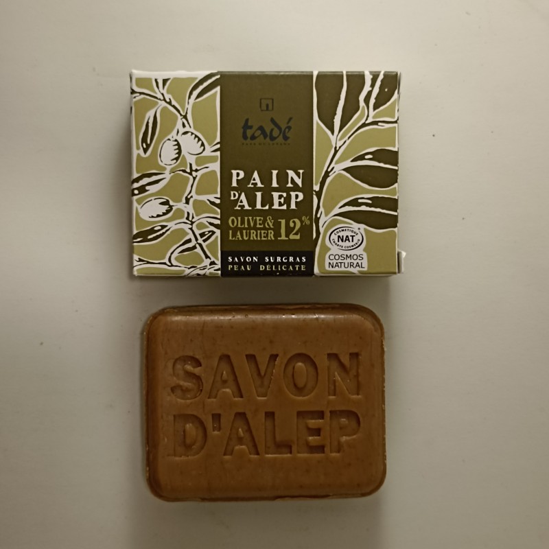 El legendario jabón de Alepo Tadé, el primero y único certificado por COSMOS, 100% de origen natural, es elaborado en Alepo, Siria, a partir de cuatro materias primas: aceite de oliva prensado en frío, aceite de laurel recogido a mano, sosa y agua.