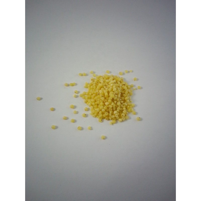 El mijo es un pequeño grano de semilla redonda con un color blanco amarillento.